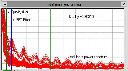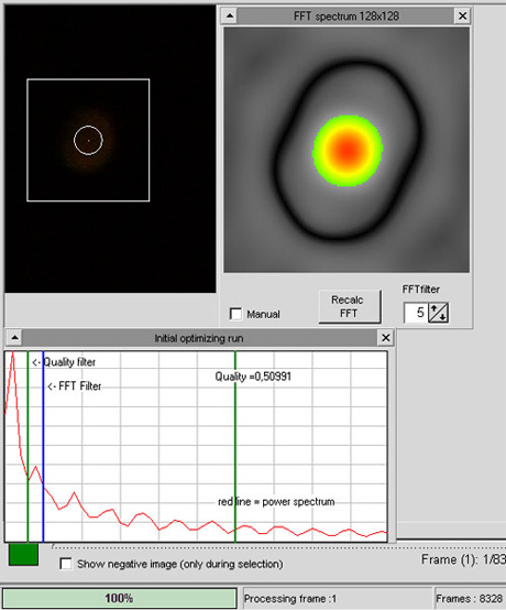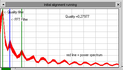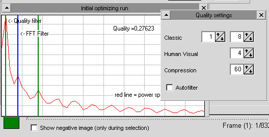 График внизу – распределение контрастности деталей на изображении планеты от их размера. Две зеленых линии (Quality filter, в дальнейшем QF) – границы частотно-контрастного спектра, по которым Регистакс будет оценивать качество каждого кадра. Синия линия – FFT, используется для выравнивания кадров при сложении.