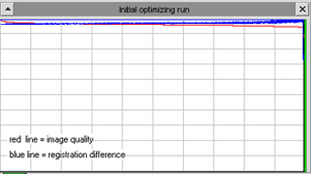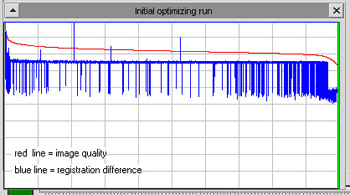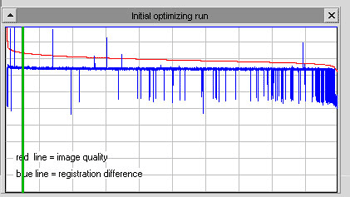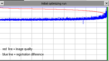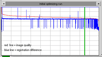 Итак, оптимизация. Если Alignement прошел хорошо, то нажимаем Optimize и смотрим, как выглядит наше изображение в окне оптимизации. Если изображение «скачет» в окошке оптимизации, значит алигнемент произведен некачественно. Обращаем внимание и на график оптимизации. Если оптимизация идет плохо, то график не будет смещаться вниз.