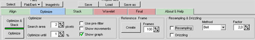 Здесь от установленных по умолчанию настроек менять ничего не нужно. Разве что стоит рассмотреть вопрос про Resampling & Drizzling. Оба эти параметра служат для увеличения размера изображения, только разными способами. При ресэмплинге просто увеличивается размер каждого элемента изображения, а при дриззлинге – расстояние между элементами изображения (пикселями), с заполнением «пустого» пространства пикселями поменьше, размер которых можно регулировать. При ресемплинге процесс начинается уже на стадии оптимизации (Optimize), а при дриззлинге – на стадии окончательного сложения (Stack).