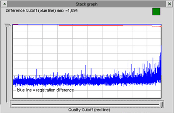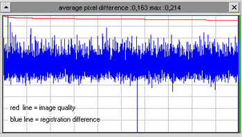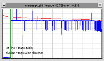 По большому счету при первом проходе график должен ложится на нижнюю горизонталь, а вот уже при следующем (процесс оптимизации занимает два – три, а иногда и более проходов) следует обратить внимание на значение Average pixel difference на верхней строке панели графика. Значение не должно превосходить 3-5 при удовлетворительной оптимизации и менее 1 - при отличной. Если Регистакс не может «уложить» смещения в эти рамки, то возвращаемся назад, редактируем ролик еще раз поаккуратнее, увеличиваем при алигнементе FFT и складываем сначала.