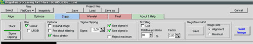 По окончании стэка, который запускается клавишей stack в левом верхнем углу, можно перераспределить «весовые коэффициенты» кадров при помощи sigma clipping. При использовании этого режима более контрастные кадры будут иметь больший вклад в суммированном изображении. Сигма клиппинг не работает при использовании дриззлинга или ресэмплинга.