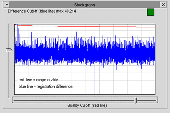 Теперь открываем справа вкладку Stackgraph и «отрезаем в нашем графике все «выбросы» от «смещенных» кадров движком на вертикальной части графика. Движком на горизонтальной части графика «отрезаем» худшие по качеству кадры, расположенные справа.