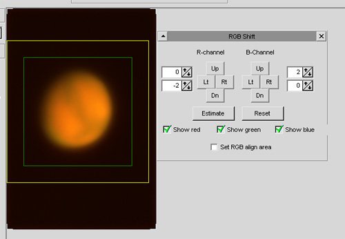 Обычно изображение центруется в квадратике автоматически, но если так не происходит, то ставим птичку на Set RGB align area, наводим курсор на центр планеты и нажимаем левую кнопку мыши. Бывает еще и так, что после, к примеру, ресемплинга, квадратик алигнемента оказывается меньше диска планеты. В таком случае возвращаемся к первой вкладке Align, там меняем птичку на Alignement box на большее значение.