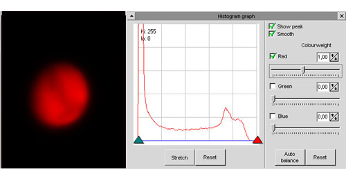Устанавливает значение яркости (Brightness) так, чтобы фон на изображении стал черным, затем движками Red, Green,Blue на панели гистограммы выравниваем цветовой баланс.