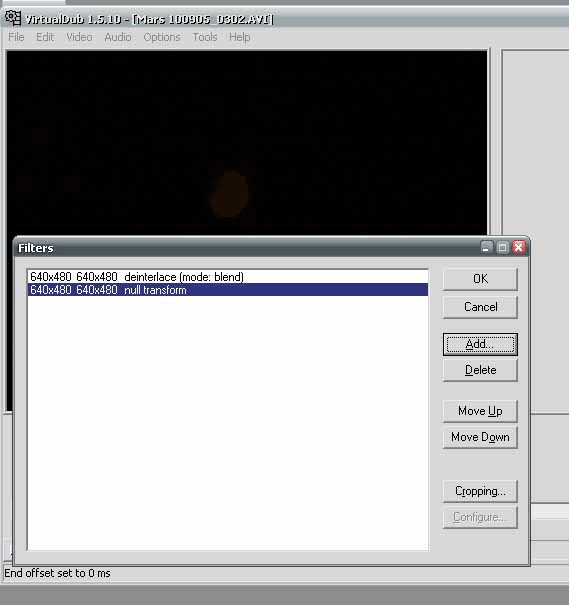 Вторым ставим фильтр null transform. Этот фильтр ничего не делает, но им можно «подрезать» изображение без потери качества. Кроппинг изображения нужен для уменьшения размера файла, он для Регистакса не должен быть более 2 Гб, да и по большому счету изображение в центре кадра всегда менее искажено аберрациями.