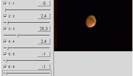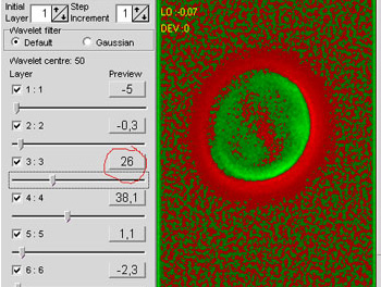 Вообще чем меньше номер слоя, тем на более мелкие детали изображения он воздействует. Первый и второй слои (Layer) воздействуют на детали соразмерные с шумом. Третий и четвертый слои выявляют на изображении больше деталей и меньше шумов, зато заметно повышают контраст изображения. Пятый и шестой слои практически не прибавляют ни шумов ни деталей, зато сильно повышают общий контраст изображения. Из этого следует, что нашими основными слоями для обработки будут третий и четвертый, а остальные будут использоваться в меньшей степени. Кстати посмотреть, что делает каждый из слоев, можно кликнув правой кнопкой мышки на окошке Preview рядом с движками слоев. Красным цветом будет показано то, что будет становиться темнее при обработке в данном слое, зеленым – то, что будет становиться светлее.