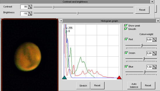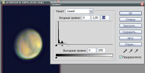 Синий канал у меня всегда прорабатывается плохо, это зависит от типа используемого приемника изображения, и поэтому я его при балансировке каналов сильно не вытягиваю, чтобы шумы в этом канале не мешали дальнейшей обработке. Для красного и зеленого каналов достаточно того, чтобы правая часть гистограммы не выходила за пределы окна графика, хотя, опять-таки в идеале, ширина гистограмм каналов должна быть тоже одинаковой.