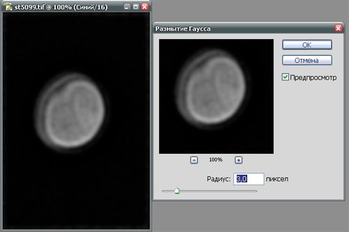 Далее устраняем кольцевые цветные ореолы при помощи фотошоповских инструментов «осветление» и «затемнение» со степенью воздействия 10-12%. Новых деталей на изображении эти действия не добавляют, а просто устраняют цветовые окантовки. Потом еще раз подправляем уровни в каждом из каналов.