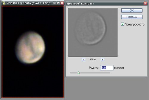 Открываем вкладку «фильтры», там раздел «другие», далее фильтр «цветовой контраст». Значением «Радиус» устанавливаем нужную степень усиления контраста.