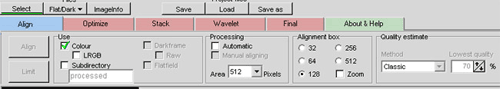 Открываем Регистакс. Отключаем всю автоматику, ставим птичку на опции Color, устанавливаем размер зоны обработки (Area) 512 пикселей, размер зоны сложения (Alignement box) 128пикселей, режим отбора по качеству (quality estimate) – classic и 70%.