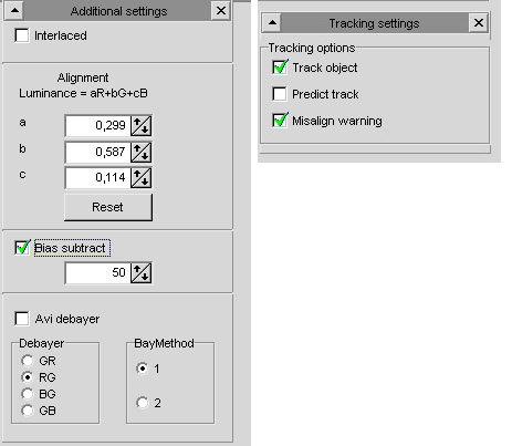 Небольшое отступление. В окошке Histogram можно просматривать каждый цветовой канал по отдельности и это навело меня на мысль о том, что и обрабатывать изображение можно поканально. Если не пользоваться дебайеризацией (разложением цветного видеоролика на три ролика в каждом из которых будет только один из цветов), то можно сложить наш исходный ролик, изменяя каждый раз критерий на яркостные весовые коэффициенты a-b-c на первой вкладке Alignement (Рис 9), а затем обработать каждый цветовой канал отдельно. Немного подробнее. На вкладке Alignement в разделе Additional (закладка справа) есть регулировка соотношения цветов, учитываемого при сложении (Рис 9). Если задать параметр «a» (красный канал) равным 1, а каналов «b» и «c» - 0, то сложение и выравнивание будет идти именно для красного канала, что будет точнее, чем для суммы всех каналов. Потом, в закладке Wavelet на панели Histogram, снимаем птички с Green и Blue, сдвигаем движки этих каналов влево до упора, устанавливаем там же весовые коэффициенты для этих каналов равными 0 и работаем только с красным каналом. То же самое потом проделываем для зеленого и синего каналов, сохраняем полученные изображения после обработки, а затем складываем в фотошопе в RGB цветное изображение.
