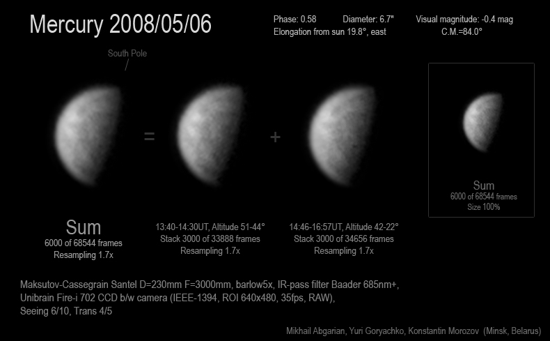 Хочется отметить, что съемка роликов велась с перерывами – как только качество атмосферы ухудшалось, съемка останавливалась. Примерно половина роликов была отснята с нулевым усилением на камере, а вторая половина, когда высота Меркурия над горизонтом уменьшилась, с гейном порядка 60%, но с меньшей выдержкой.